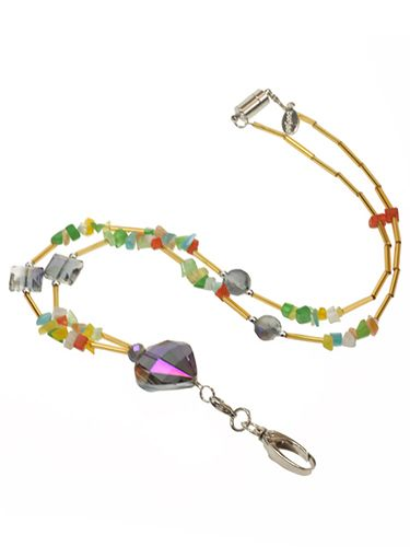 Colorful natural stone chips, contrast nicely with large faceted smoke colored accent beads and gold bugle beads. Our Taos fashion lanyard is too pretty to leave at the office, so we made the ID hook removable for both day and night wear.